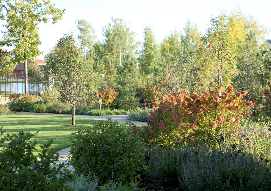 С помощью приемов геопластики были созданы живописные холмы, на которых были высажены деревья, массивы кустарников и многолетников.